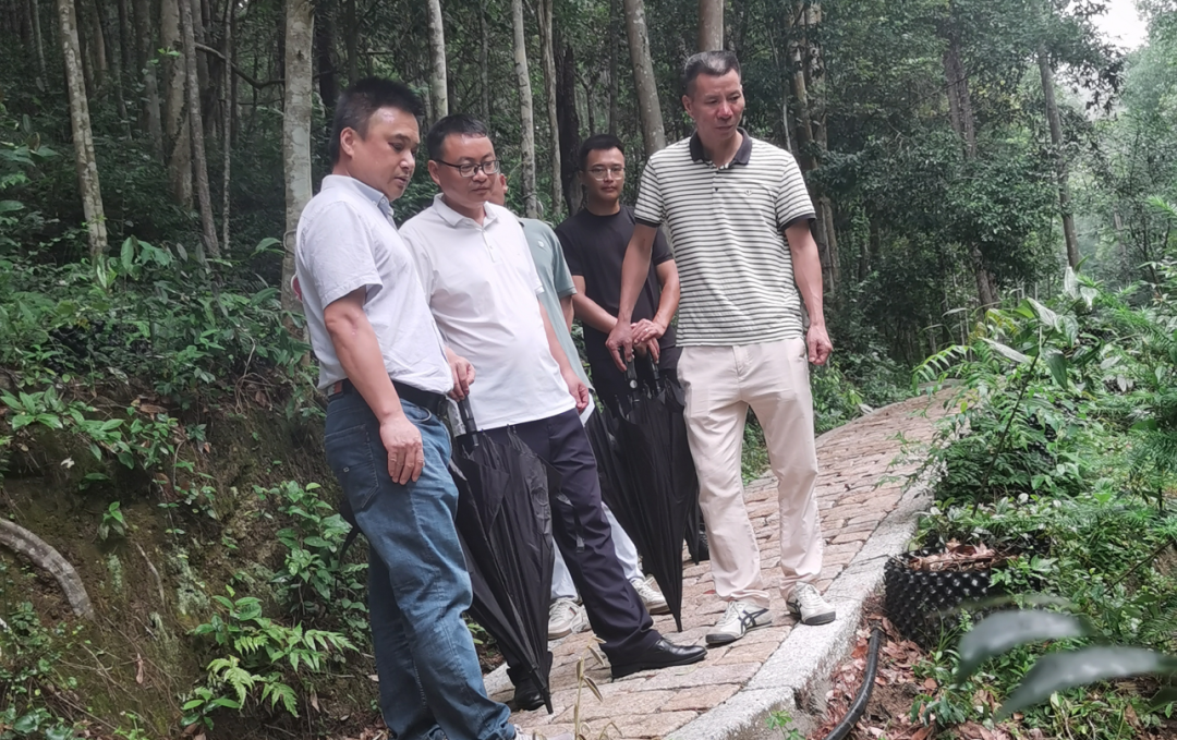 8月19日,集团总经理练必钦同志一行驱车来到邵武市二都国有林场,实地考察南平市国家储备林质量精准提升工程项目,开展调研工作。邵武市广森营林投资有限责任公司经理林辉、邵武市二都国有林场场长刘红跃、南平储备林建设发展有限公司总经理赵福宏等陪同调研。 邵武市广森营林投资有限责任公司作为南平市国家储备林质量精准提升工程项目邵武市域内项目建设单位,其经理林辉同志首先介绍了几年来邵武市在项目建设中所取得的成效。练必钦总经理详细询问了项目建设进度、亮点、堵点、难点以及项目投资、运营计划,又冒雨实地考察了邵武市二都国有林场林下经济建设情况,听取了邵武市二都国有林场场长刘红跃关于邵武市二都国有林场利用林下空间发展中草药产业经验介绍。