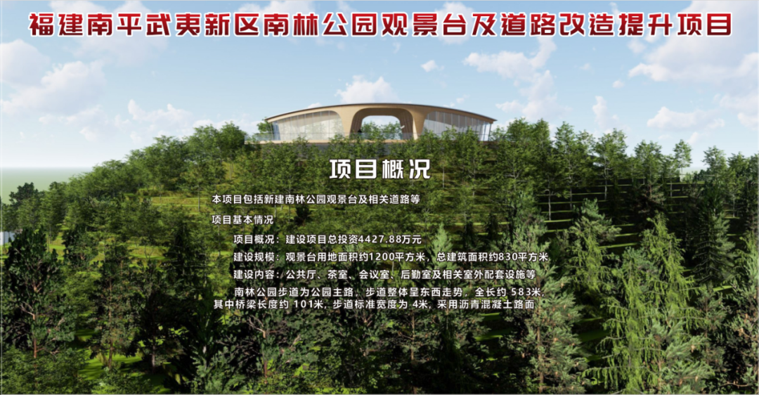1月13日上午,福建南平武夷新区南林公园观景台及道路改造提升项目在南林公园举办开工仪式,该项目的代业主单位为福建省闽北水利水电工程公司。参加本次开工仪式的有:南平市武夷新区管理委员会、南平市城市公园服务中心、在线成人视频 、南平武夷新区城市发展集团有限公司、福建省闽北水利水电工程公司等主要单位及领导。 南林公园观景台及道路改造提升项目本项目包括新建南林公园观景台及相关道路等。建设项目总投资4427.88万元。建设规模为观景台用地面积约1200平方米,总建筑面积约830平方米,建设内容包含公共厅、茶室、会议室、后勤室及相关室外配套设施等;南林公园步道为公园主路,步道整体呈东西走势,全长约 583m,其中桥梁长度约 101m,步道标准宽度为 4m,采用沥青混凝土路面。