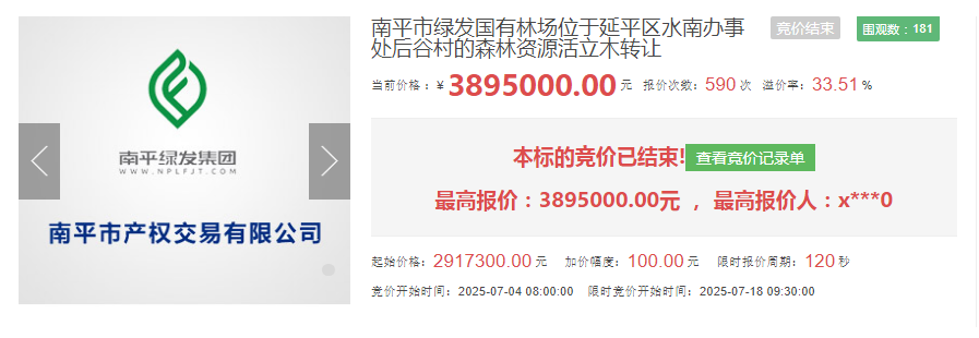 近日,延平区水南办事处后谷村的森林资源活立木转让项目在南平市产权交易有限公司溢价成交。此次标的挂牌价291.73万元,成交价389.5万元,溢价97.77万元,溢价率33.51%,是南平市产权交易有限公司打造南平市综合性要素平台,不断拓宽交易品种,下沉服务重心的有效尝试。