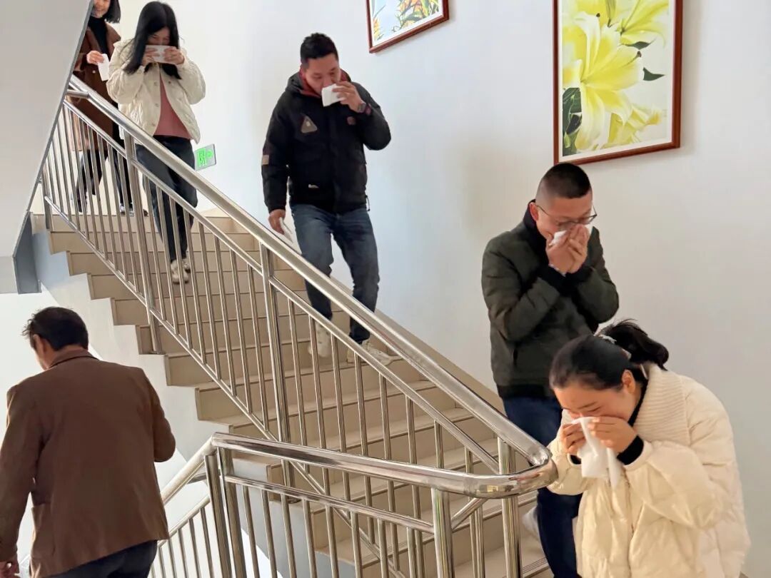 理论授课结束后,一场无预告的实战演练随即拉开帷幕。随着尖锐的警报声突然响起,演练正式启动。集团副总经理黄晓斌担任此次演练的总指挥,迅速统筹协调各项工作。在疏散引导员的有序指挥下,全体员工保持冷静,用湿毛巾或衣物掩住口鼻,采取弯腰低姿的正确姿势,沿着预定疏散路线快速、有序地向室外安全区域撤离。整个疏散过程紧张而有序,最终仅用 3 分钟便完成了全员安全撤离,充分检验了集团应急疏散预案的科学性与可操作性,也展现了员工们良好的应急反应能力与协作精神。