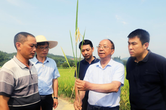 中国科学院院士谢华安(右二)到浦城指导再生稻新品种全程机械化栽培头季现场测产验收工作 (资料图 柯聪 何周超/摄)